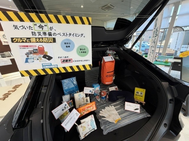 鹿児島トヨタ中山店にクルマに備える防災グッズを展示しております!